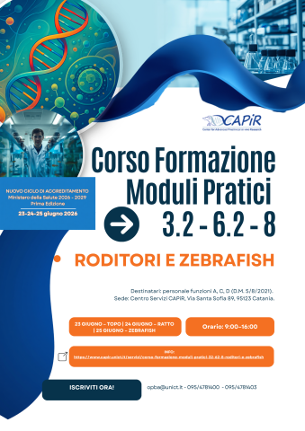 Per maggiori informazioni, visita la pagina dedicata: https://www.capir.unict.it/servizi/corso-formazione-moduli-pratici-32-62-8-roditori-e-zebrafish